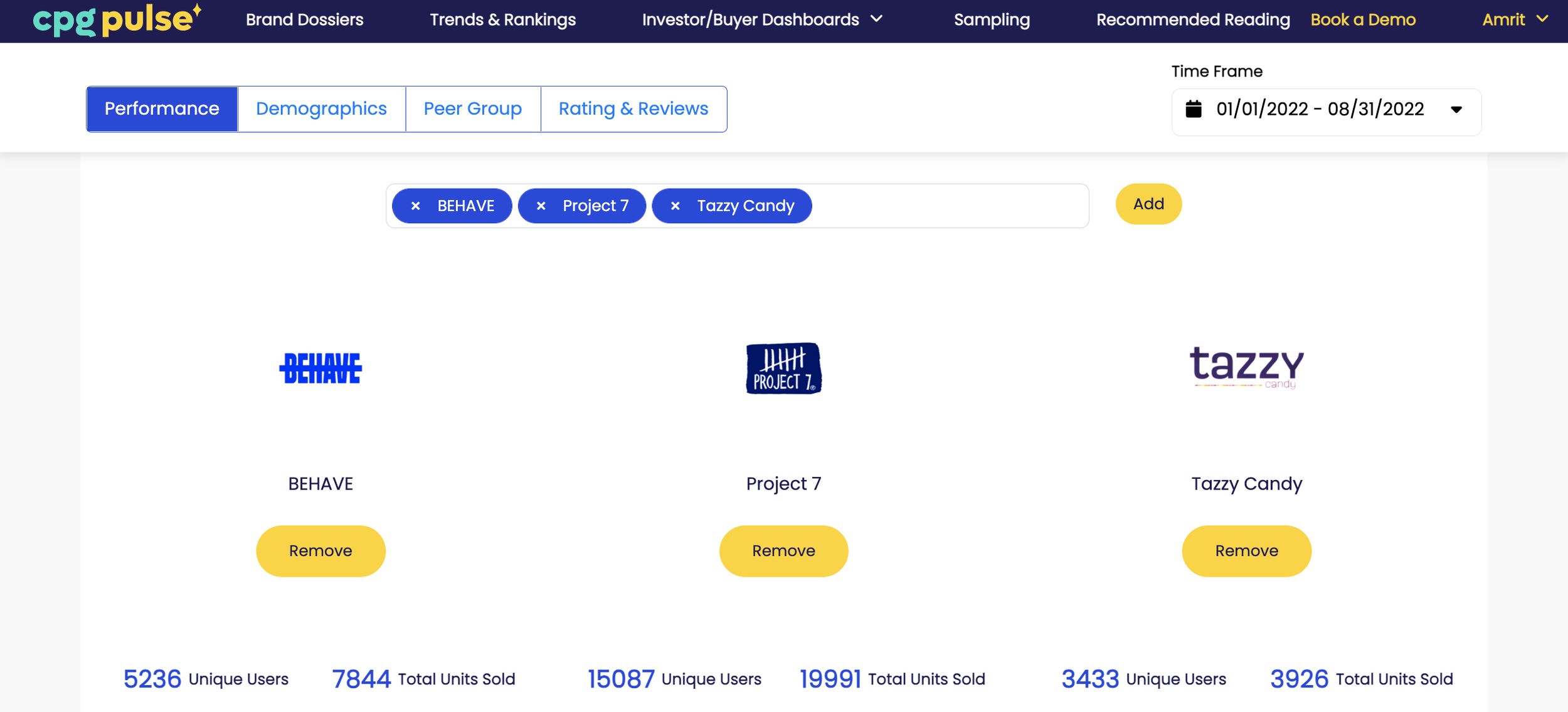Using CPGPulse we compared sales of BEHAVE, Project 7, and Tazzy on SnackMagic since 1/1/2022.