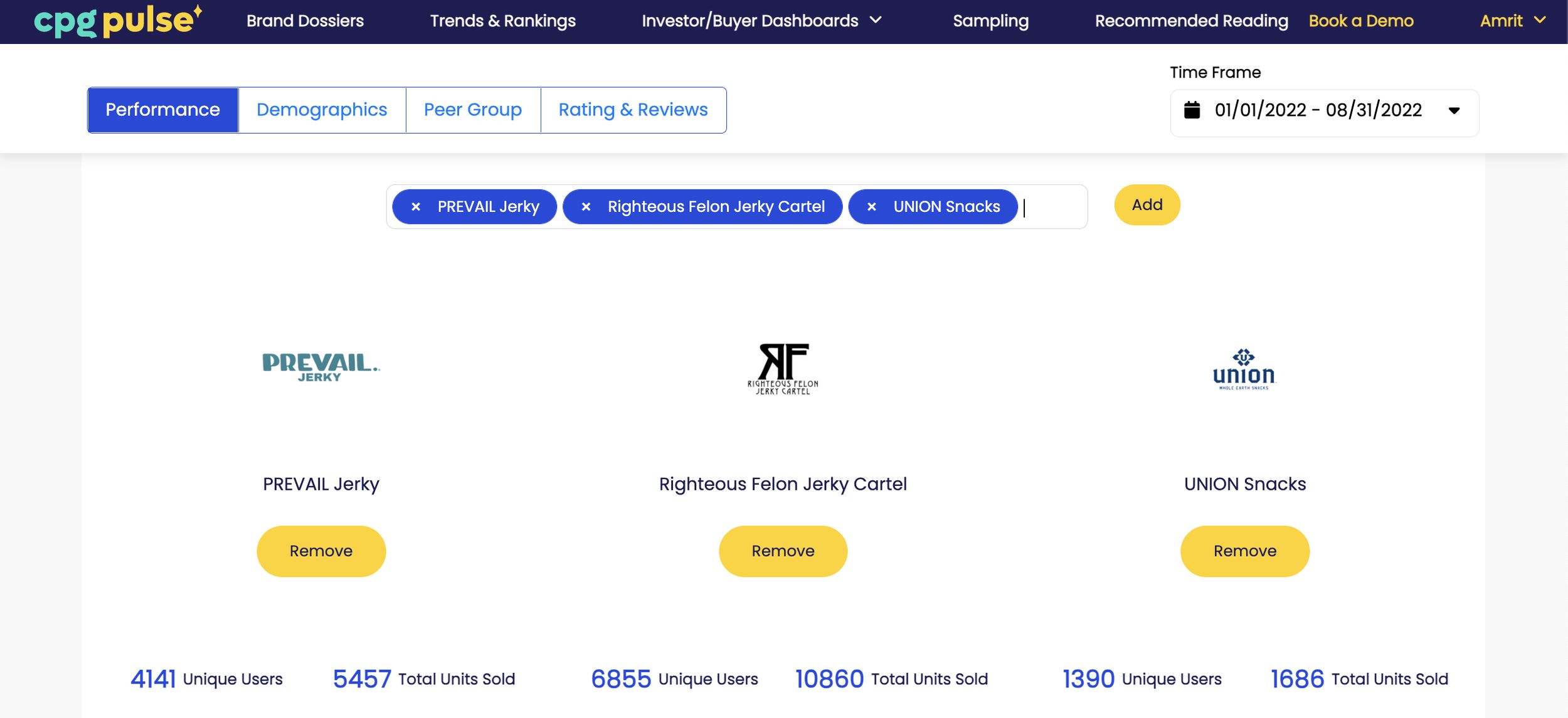 Using CPGPulse we compared sales of PREVAIL Jerky, Righteous Felon Jerky Cartel, and UNION Snacks on SnackMagic since 1/1/2022.
