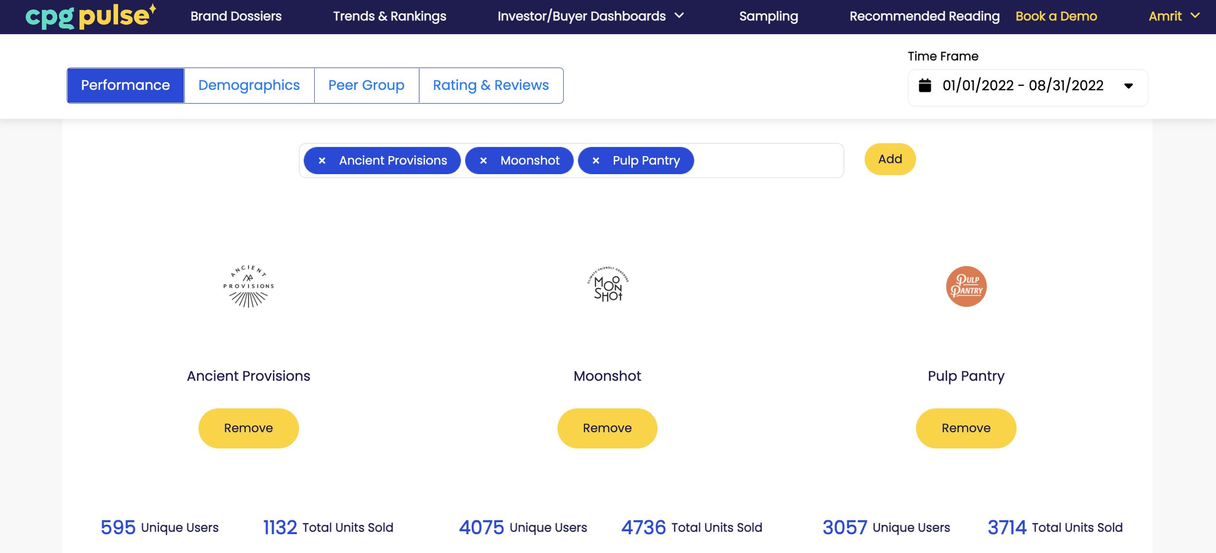 Using CPGPulse we compared sales Ancient Provisions, Moonshot, and Pulp Pantry on SnackMagic since 1/1/2022.